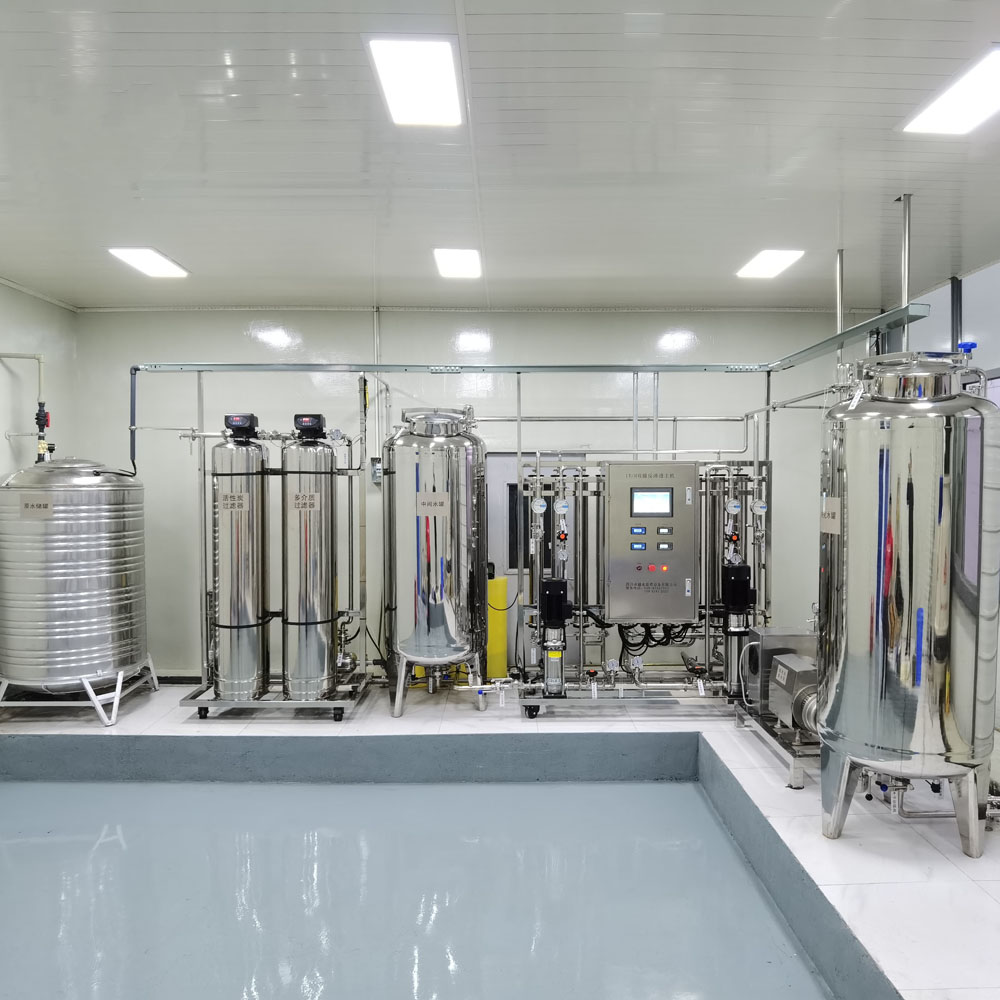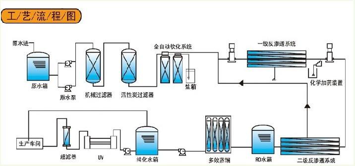 (1)預處理+ 一級反滲透+二級反滲透+滅菌裝置+循環(huán)系統(tǒng)