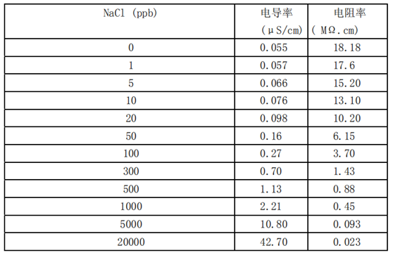 電導(dǎo)率的計算公式如下:X 是電導(dǎo)率, F 是法拉第常數(shù), Ci 是某種離子濃度, Zi 是離子的電荷數(shù) ,Ui指離子遷移率X = FΣ CiZiUi 理論上,完全不含離子的超純水在25oC時電導(dǎo)率為0.055μS/cm。電阻率是電導(dǎo)率的倒數(shù)。 那么R=1/X , 1/0.055=18.1818 約為 18.2 MΩ.cm 在25oC 時,NaCl濃度與電導(dǎo)率/電阻率值的關(guān)系。